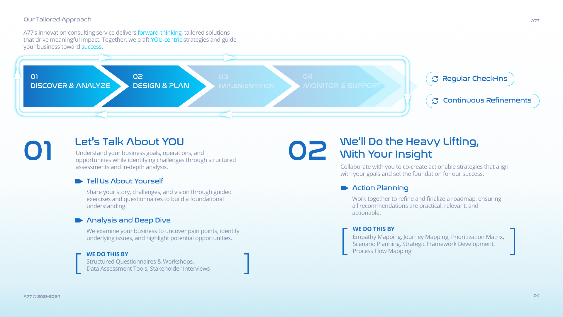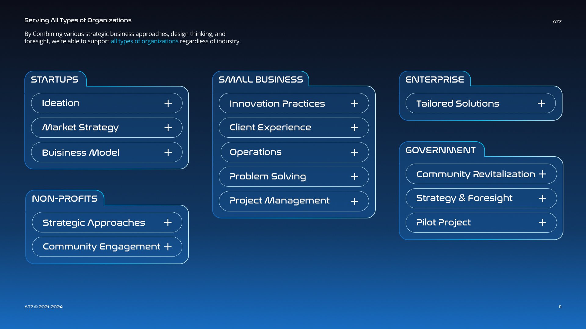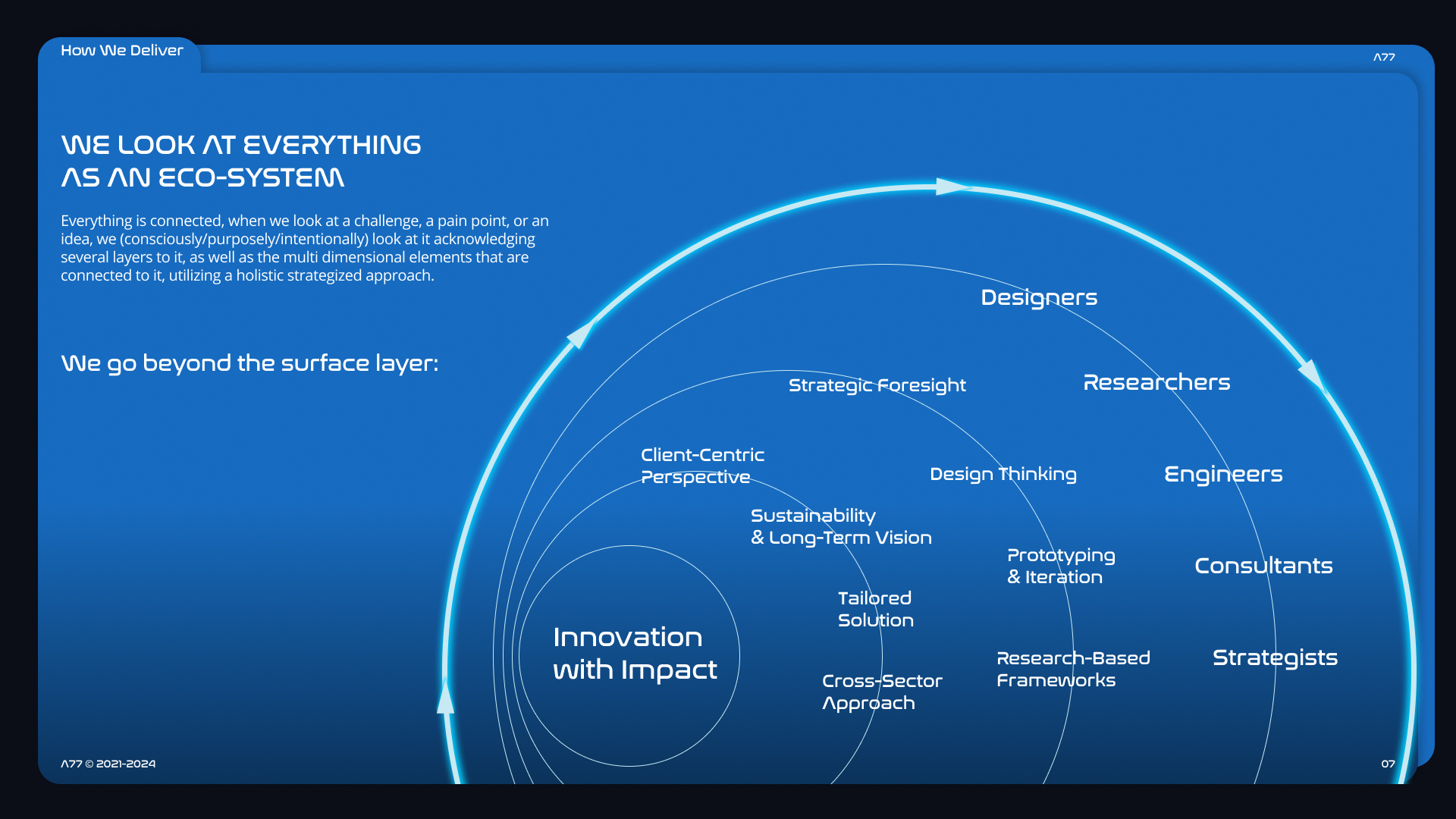 As A77’s innovation consulting practice continued to grow across sectors, there was an opportunity to better structure how services were delivered across projects. The internship focused on translating past project learnings into a more consistent and scalable consulting service model.